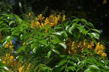 - ดอก : ออกดอกเป็นช่อแบบช่อกระจะ โดยจะออกบริเวณซอกใบหรือที่ปลายกิ่ง โคนก้านมีใบประดับ 1-2 อัน ลักษณะเป็นรูปรี กลีบเลี้ยงดอกมี 5 กลีบ ติดกันเป็นถ้วยสีเขียว ปลายแยกเป็นแฉก 2 แฉก แบ่งเป็นอันบน 2 กลีบติดกัน และอันล่าง 3 กลีบติดกัน ส่วนกลีบดอกมี 5 กลีบ สีเหลืองแกมแสด ลักษณะของกลีบเป็นรูปผีเสื้อ ดอกมีกลิ่นหอมแรง จะบานและร่วงพร้อมกันทั้งต้น โดยจะออกดอกในช่วงเดือนมีนาคมถึงเดือนเมษายน